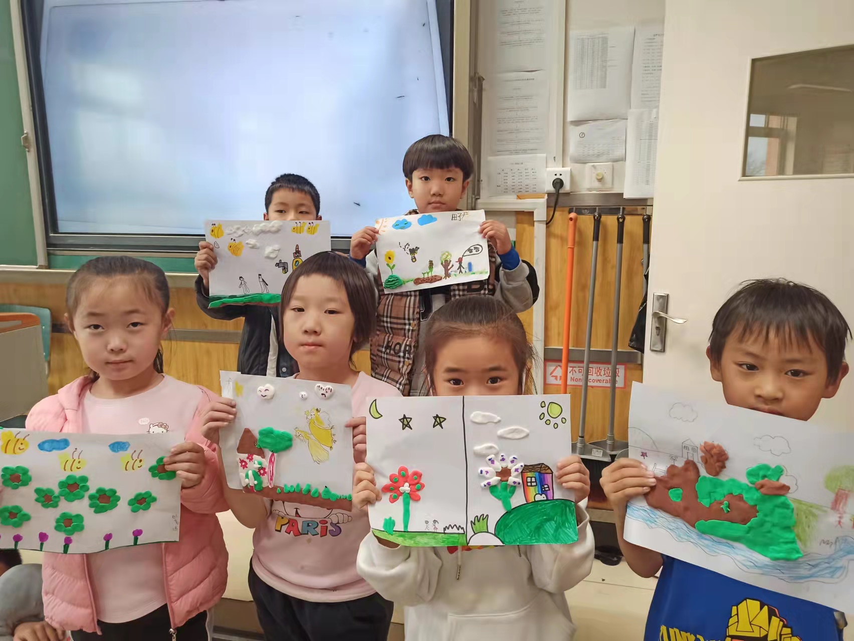 今天,社团课上老师带我们做了彩泥画,先在白纸上自由作画,再用彩泥装饰,我们玩得开心极了!看我们做的画多漂亮!